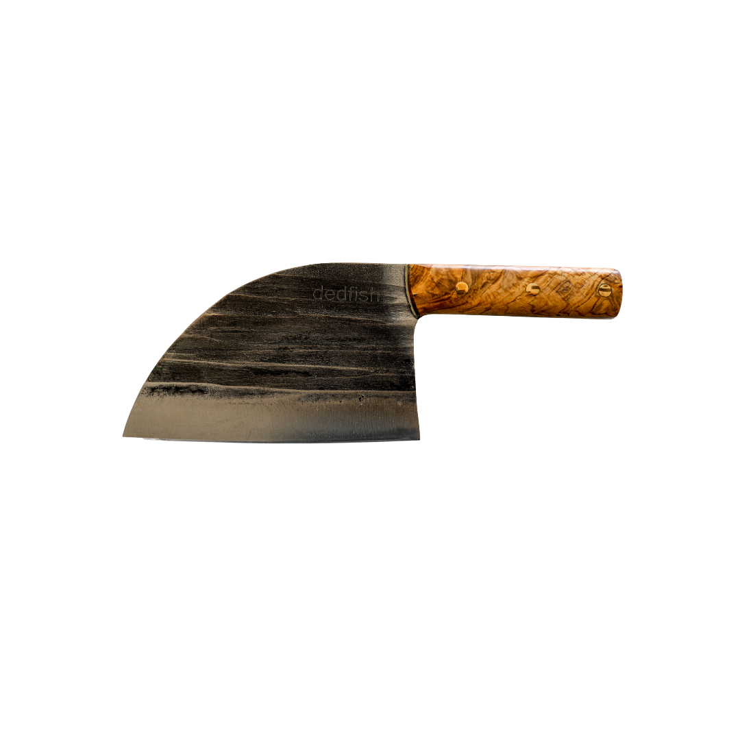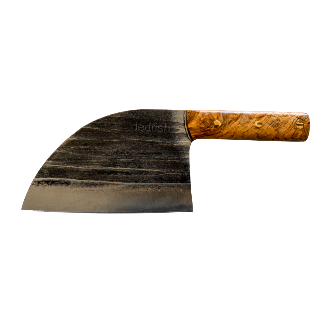 The Dedfish Co. Cleaver comes with a beautiful protective leather sheath fixed with a stud latch to protect the blade while also allowing it to be attached to a belt, bag or anywhere you prefer for easy carrying when using outdoors.