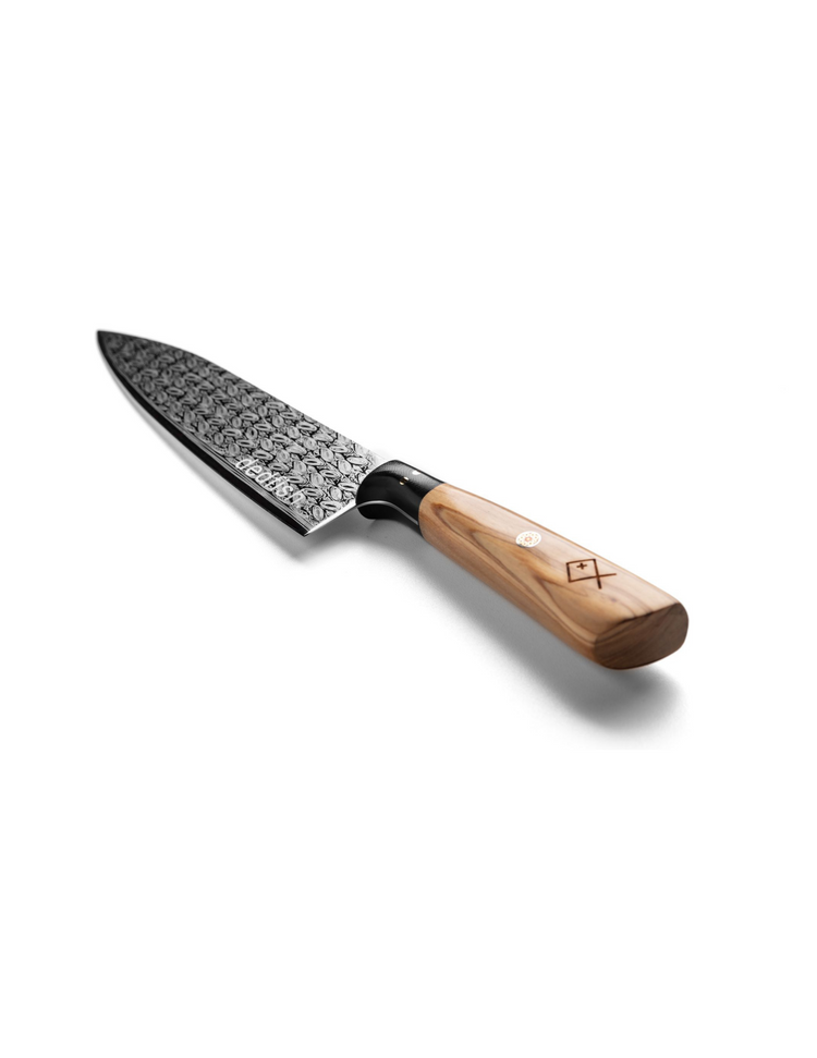 HANDLE MATERIAL: Our handles are made from Olive Wood sourced from Southern Italy. We use this wood sustainably since its a by-product of the agricultural industry. Our olive wood is harvested from older trees that are unproductive for fruit. With incredible natural anti-bacterial benefits, olive wood makes for a perfect knife handle. It stays smooth and intact for long periods of time and it's rich and beautiful gran gives our handles that exquisite quality.